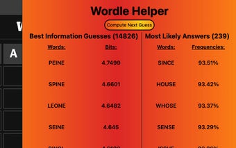 ด้วย Wordle Helper ผู้ใช้สามารถเข้าถึงคุณลักษณะที่เรียกว่า "Compute Next Guess" เพื่อวิเคราะห์ความก้าวหน้าของเกมของพวกเขาและรับข้อเสนอแนะที่มีคุณค่า ส่วนขยายนี้สร้างรายการคำศัพท์สองรายการ: หนึ่งเน้นการสร้างข้อมูลเพิ่มเติมและอีกหนึ่งเน้นคำตอบที่เป็นไปได้ ไม่ว่าคุณต้องการคำใบ้ตลอดเกมหรือเพียงแค่การช่วยเหลือเล็กน้อยเมื่อติดขัด เครื่องมือนี้ให้ความช่วยเหลือที่ปรับให้เหมาะกับคุณ